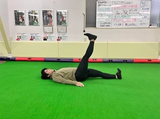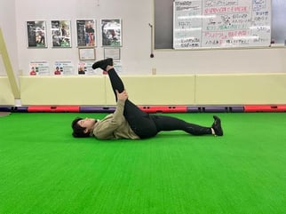仰向けで片脚を上げたら、「手もしくはタオルを使って引っ張って」さらに脚を上げてみて下さい。